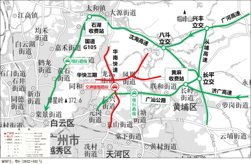 其中,为避开机场北立交、杨荷立交南行行车缓慢,建议大广高速返程旅客在从埔高速或从化收费站经国道G355,通过G105绕行进入市内。