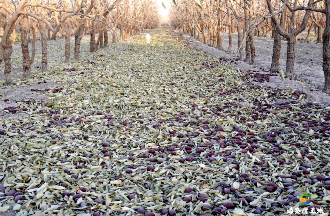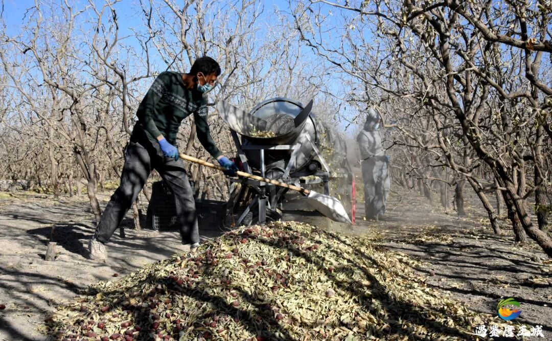与普通红枣不同,三师红枣是在树上自然风干后才开始采收,形成“树上吊干”的独特景观,故也称“吊干枣”。采收现场,枣农用木杆轻敲树枝,让红枣纷纷落下。为加快收获速度,枣农还会用鼓风机清杂、电动筛选机分选,过滤掉树叶和沙土。