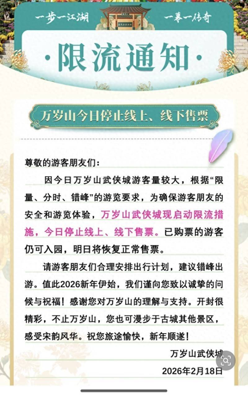 18日,万岁山武侠城公众号发布限流通知,称因今日万岁山武侠城游客量较大,根据“限量、分时、错峰"的游览要求,为确保游客朋友的安全和游览体验,万岁山武侠城现启动限流措施,“今日停止线上、线下售票。已购票的游客仍可入园,明日将恢复正常售票。”